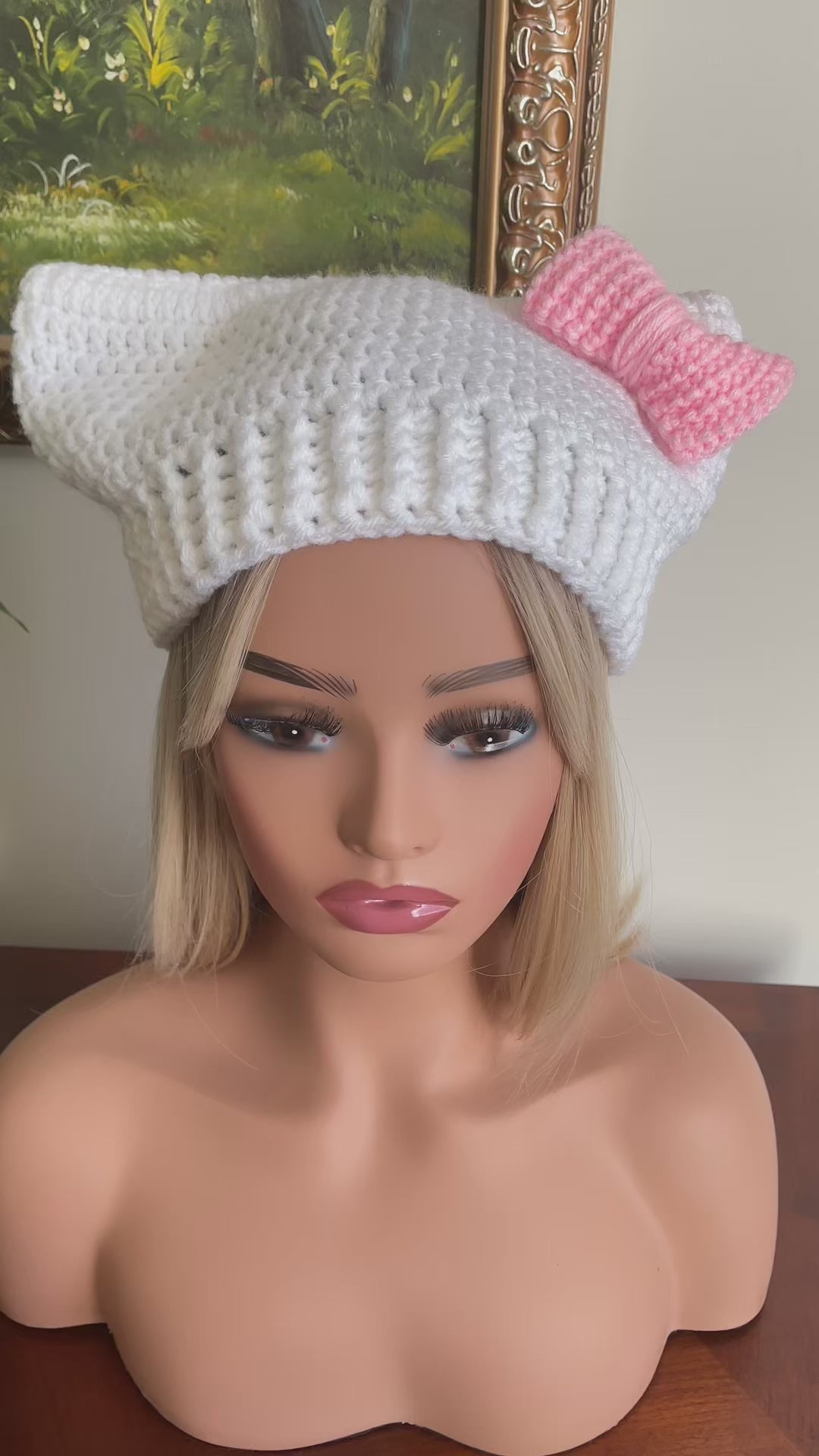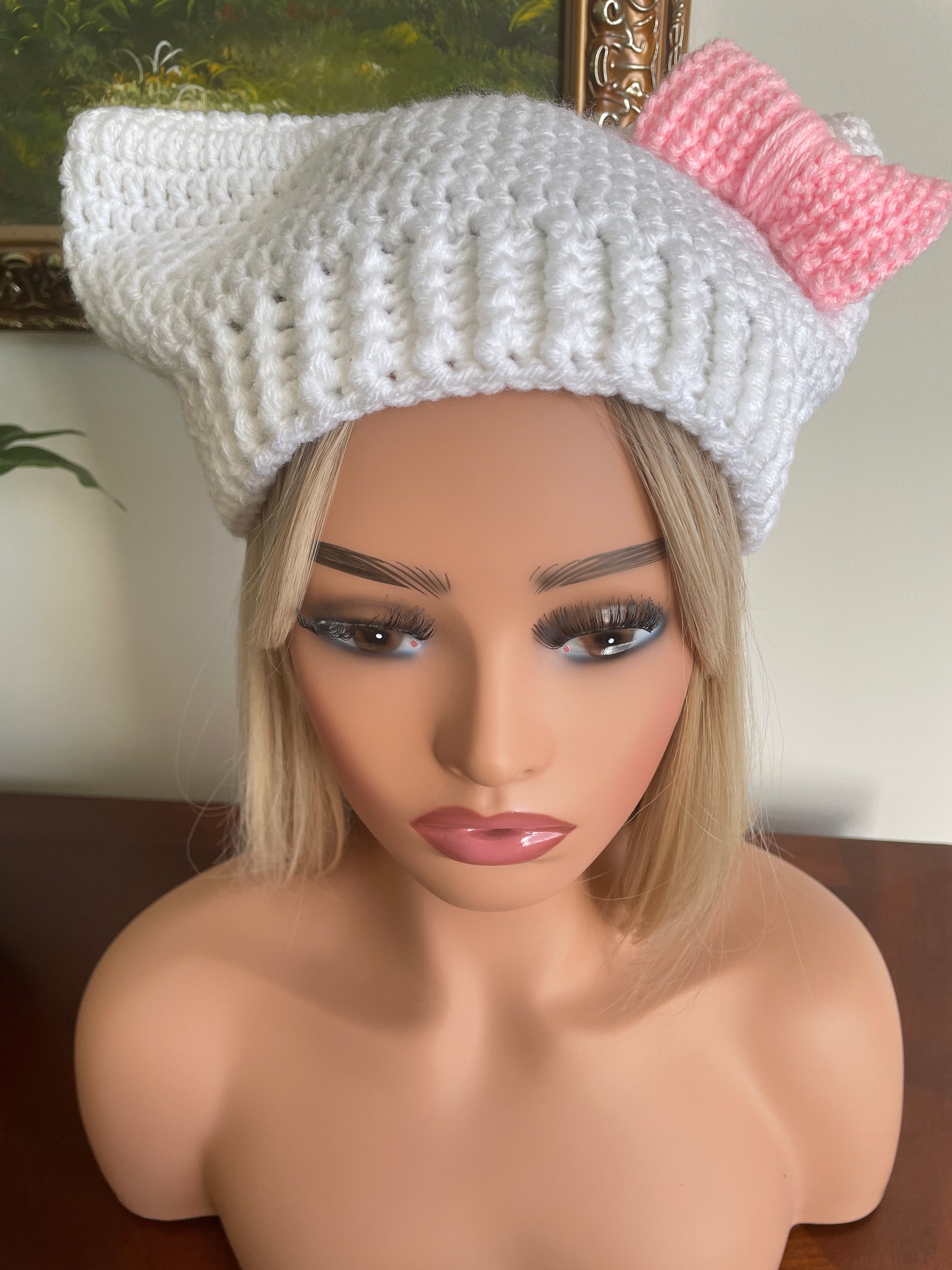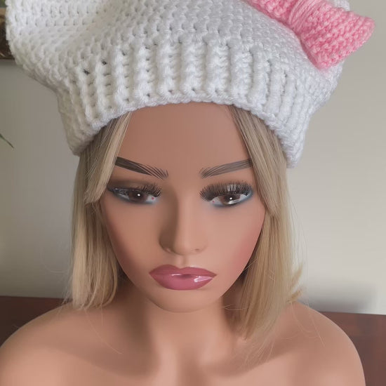 New Handcrafted . Cute Cat Ear Beanie in white with pink bow. It’s soft, stretchy, lightweight and warm. Stay warm while looking cute!