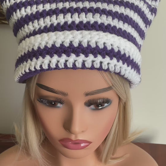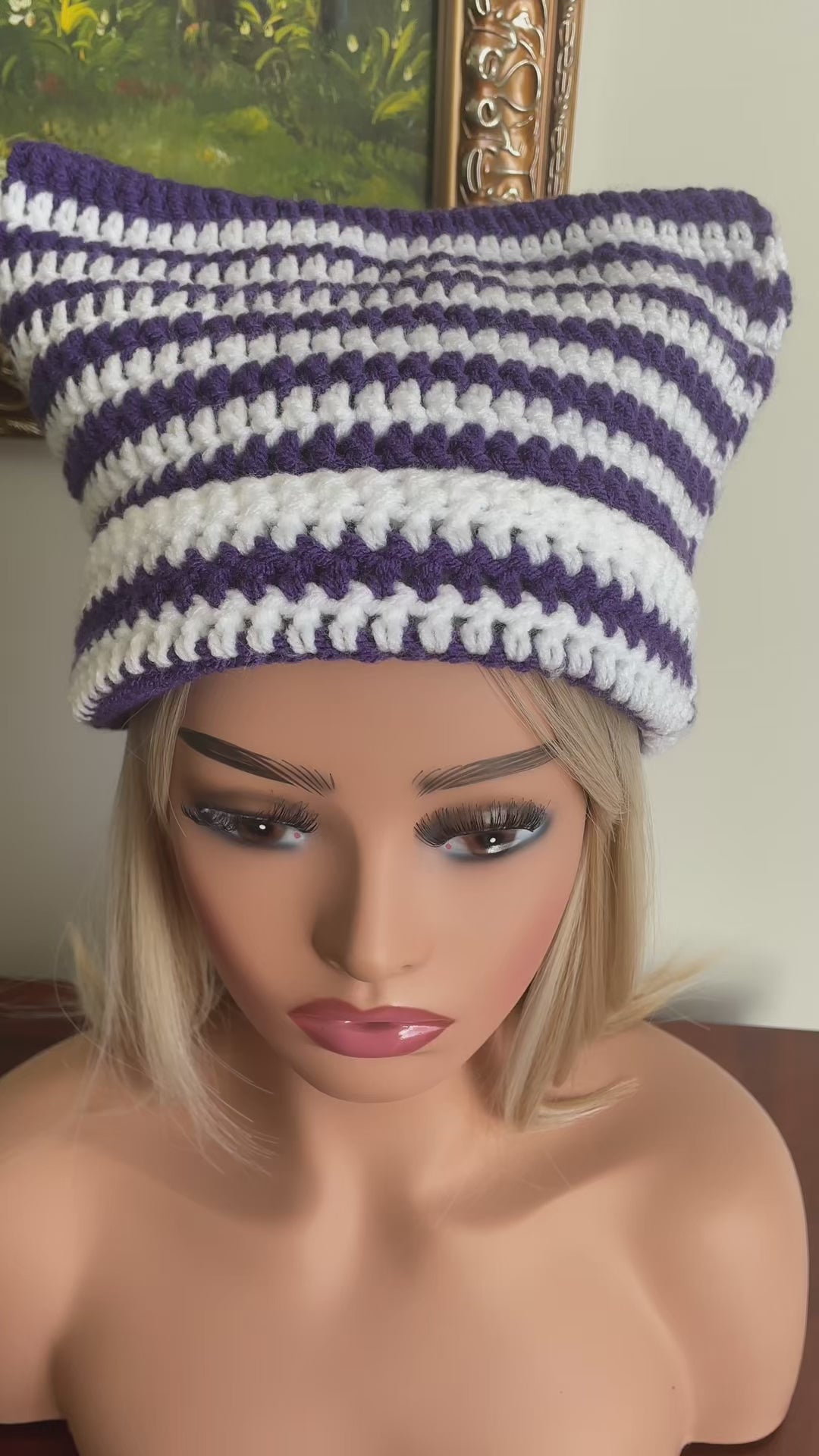 New Handcrafted . Cute Cat Ear Beanie in purple and white color. It’s soft, stretchy, lightweight and warm. Stay warm while looking cute!